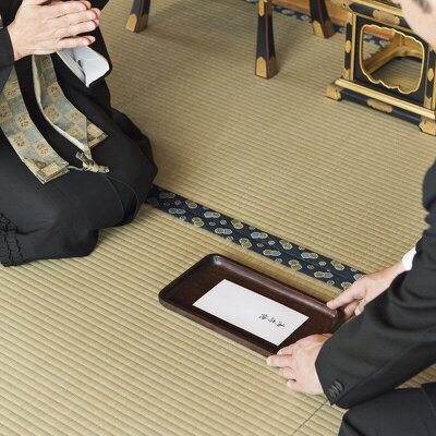 - 僧侶へのお礼(お布施・お車代)などをお渡しします。小さなお盆に載せたり、ふくさに包んで僧侶の方に向けてお渡しください。